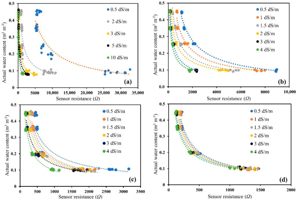 Results demonstrate that sensor performance is soil-type dependent: sandy soils are more sensitive to salinity and moisture variations, while clay loams and loamy soils maintain stable readings across a wide range of conditions.