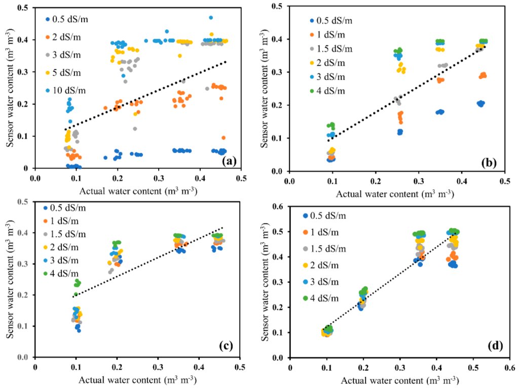 The precision of Sensoterra soil moisture sensors was evaluated by comparing measured values with actual water content across different soil types and solution salinity (ECw).